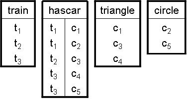 このデータベースには、列車を登録する関係表trainや、列車がどの貨車を持っているかを表す関係表hascar、貨車に積まれている荷物の特徴を表す関係表triangle、circleなどの複数の関係表があるとします。